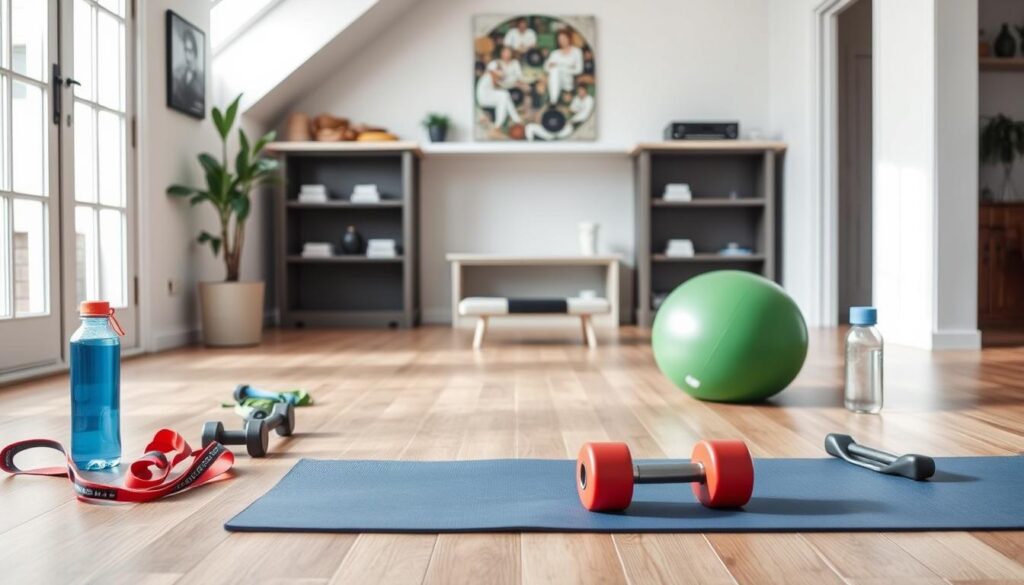 You don’t need fancy gear to work out at home. A yoga mat, dumbbells, and a resistance band are enough. Make sure you have a dedicated space, like a home gym or a quiet corner.